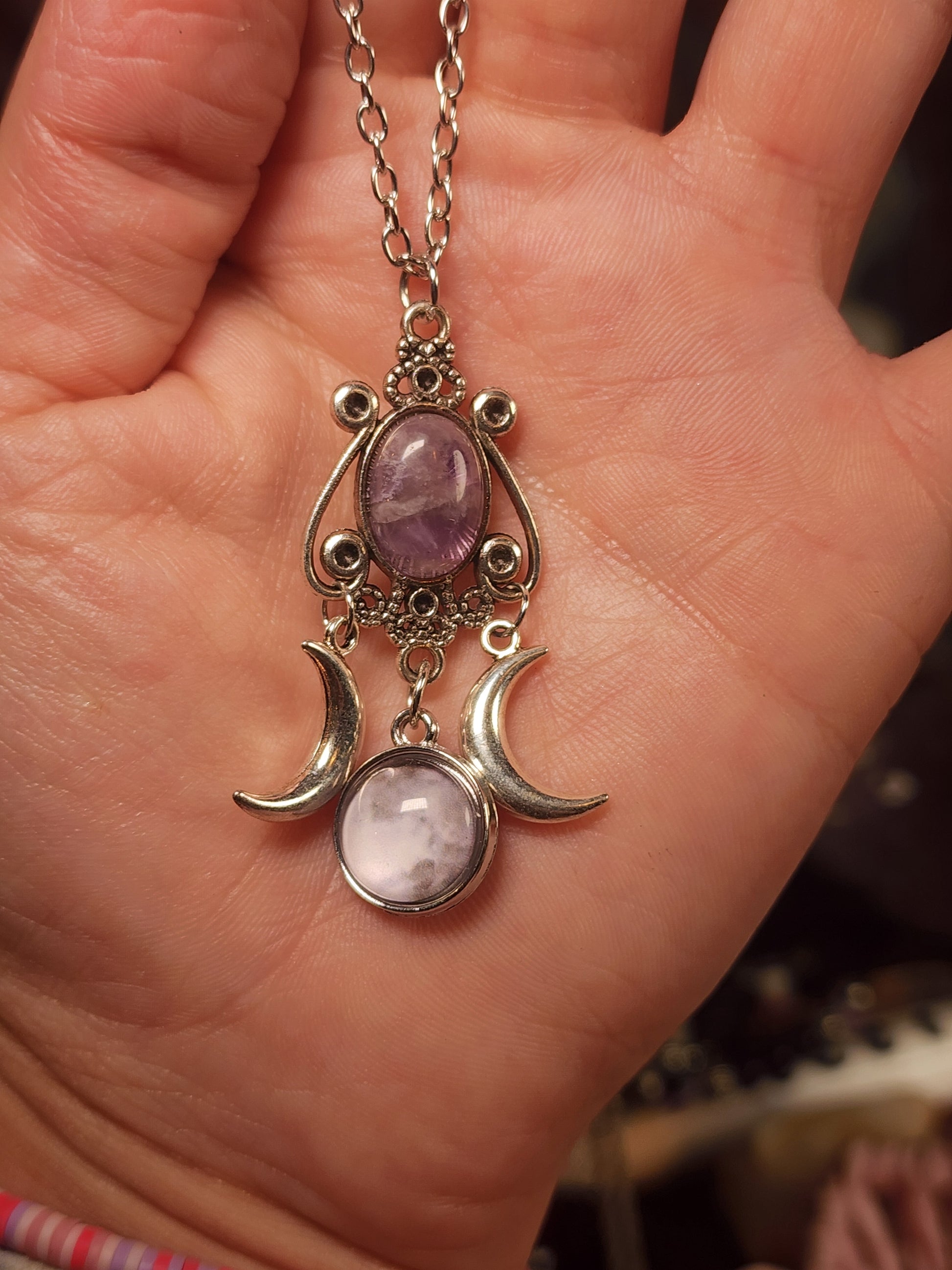 This is such a special necklace. It has a realistic moon portrait with a beautiful amethyst crystal. It comes on a silver chain โก if you love the moon, this is for you!!ย
