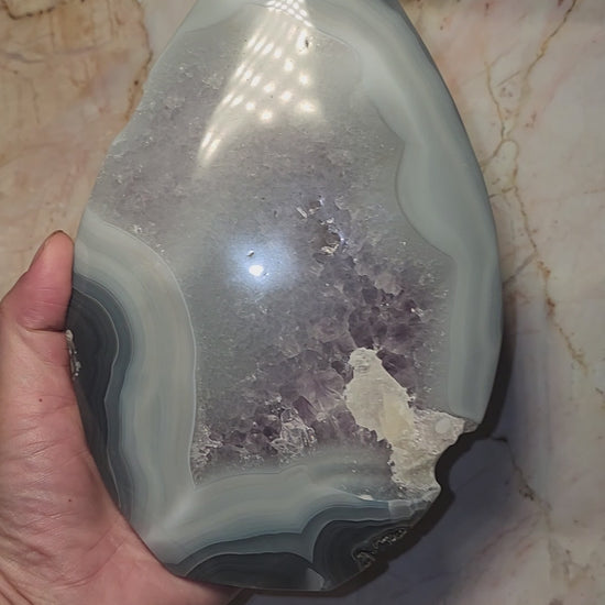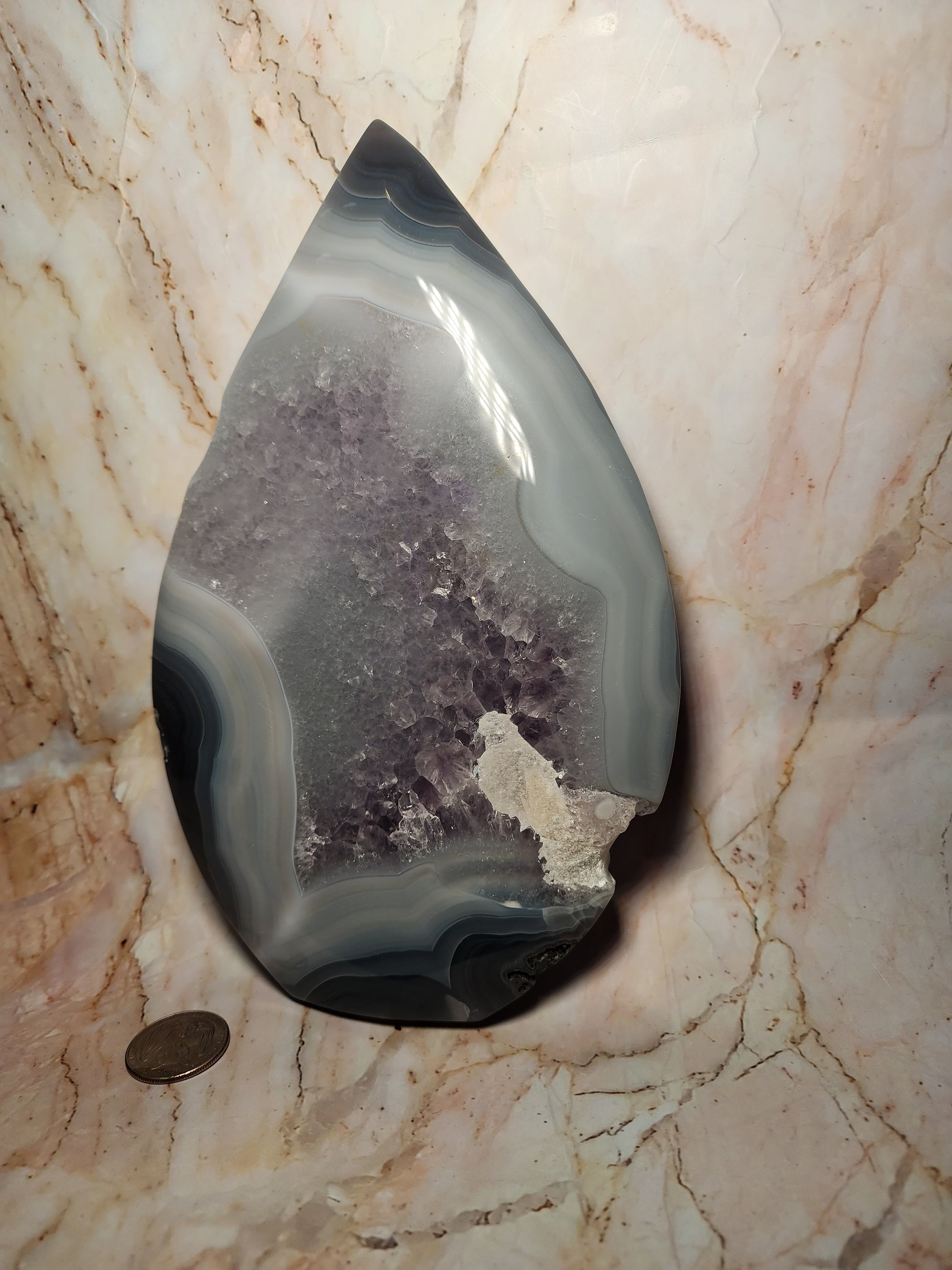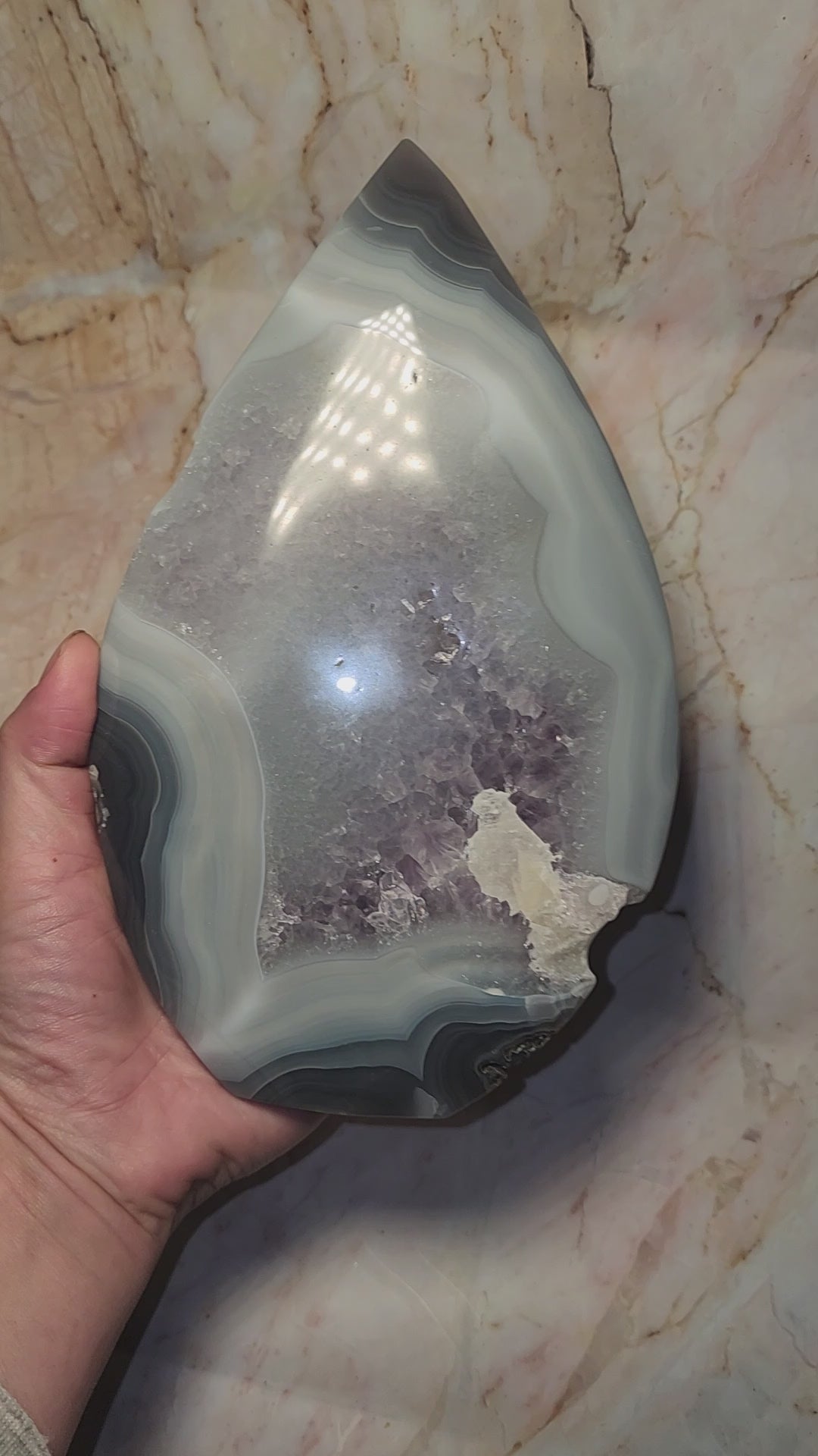 This is a stunning banded agate flame with amethyst & calcite. ๐ย