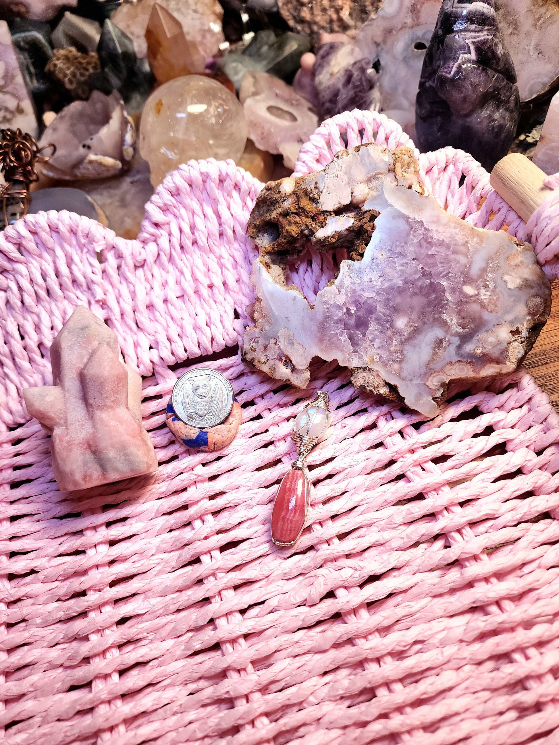 This beautiful purple/pink bundle includes a pink amethyst/purple amethyst druzy slab with a pink opal crystal cluster carving and last but not least!!.... a rhodocrosite & flashy white moonstone pendant!