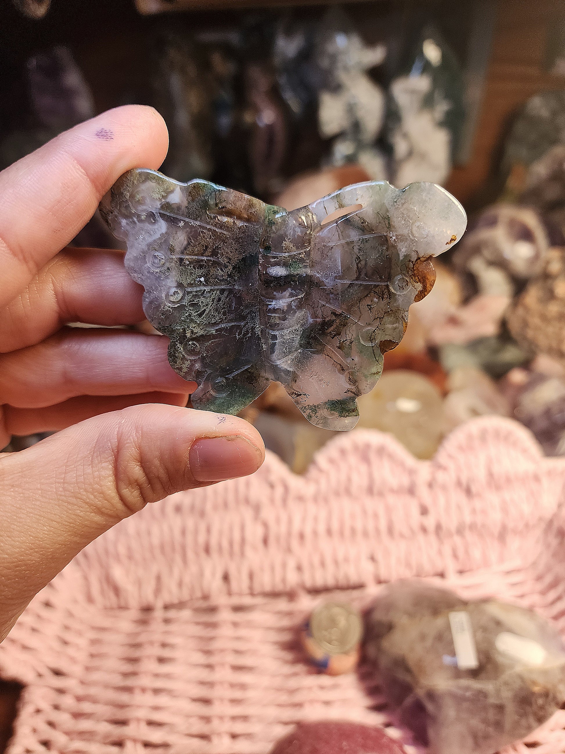 A beautiful Brazilian Smokey Amethyst Hearts with a hq rhodonite palm and a stunning moss agate butterfly