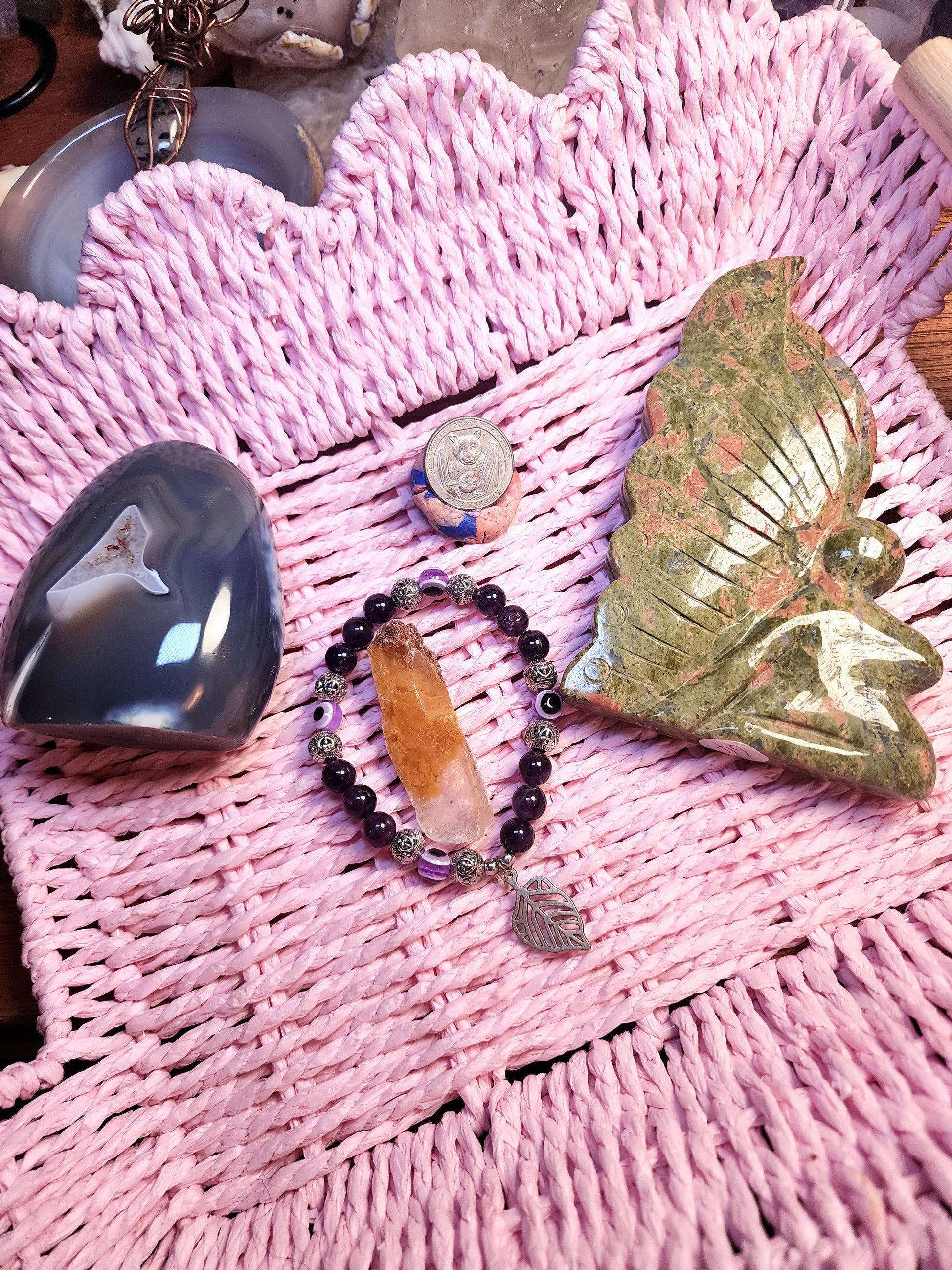 This is a awesome bundle! Which includes a large unakite fairy, a amethyst evil eye leaf bracelet, a hq natural golden selenite chunk and a chunky banded orca agate freeform!!!!