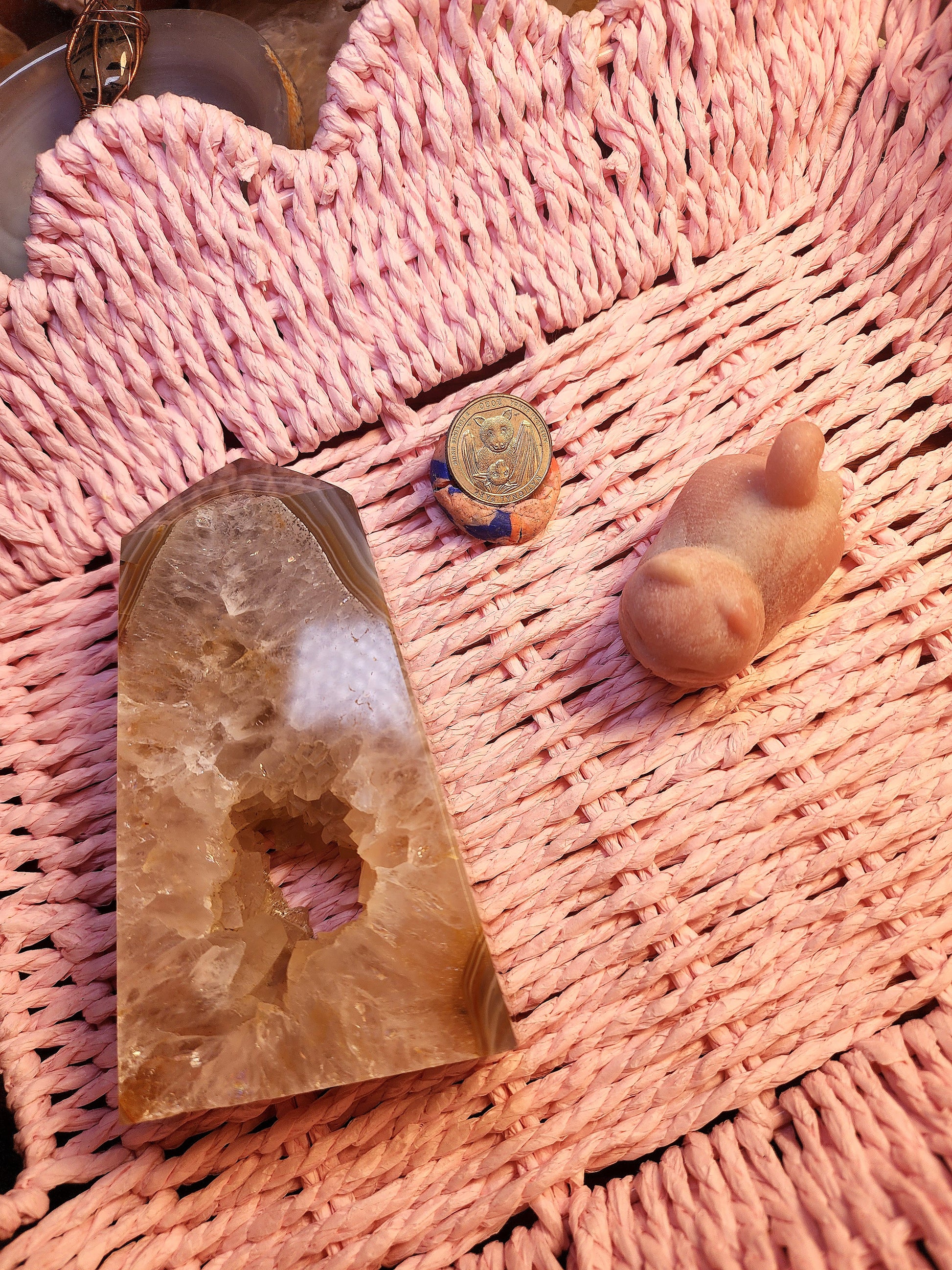 A large druzy banded agate tower with a portal druzy!! Paired with a pink opal sleeping kitty ♡