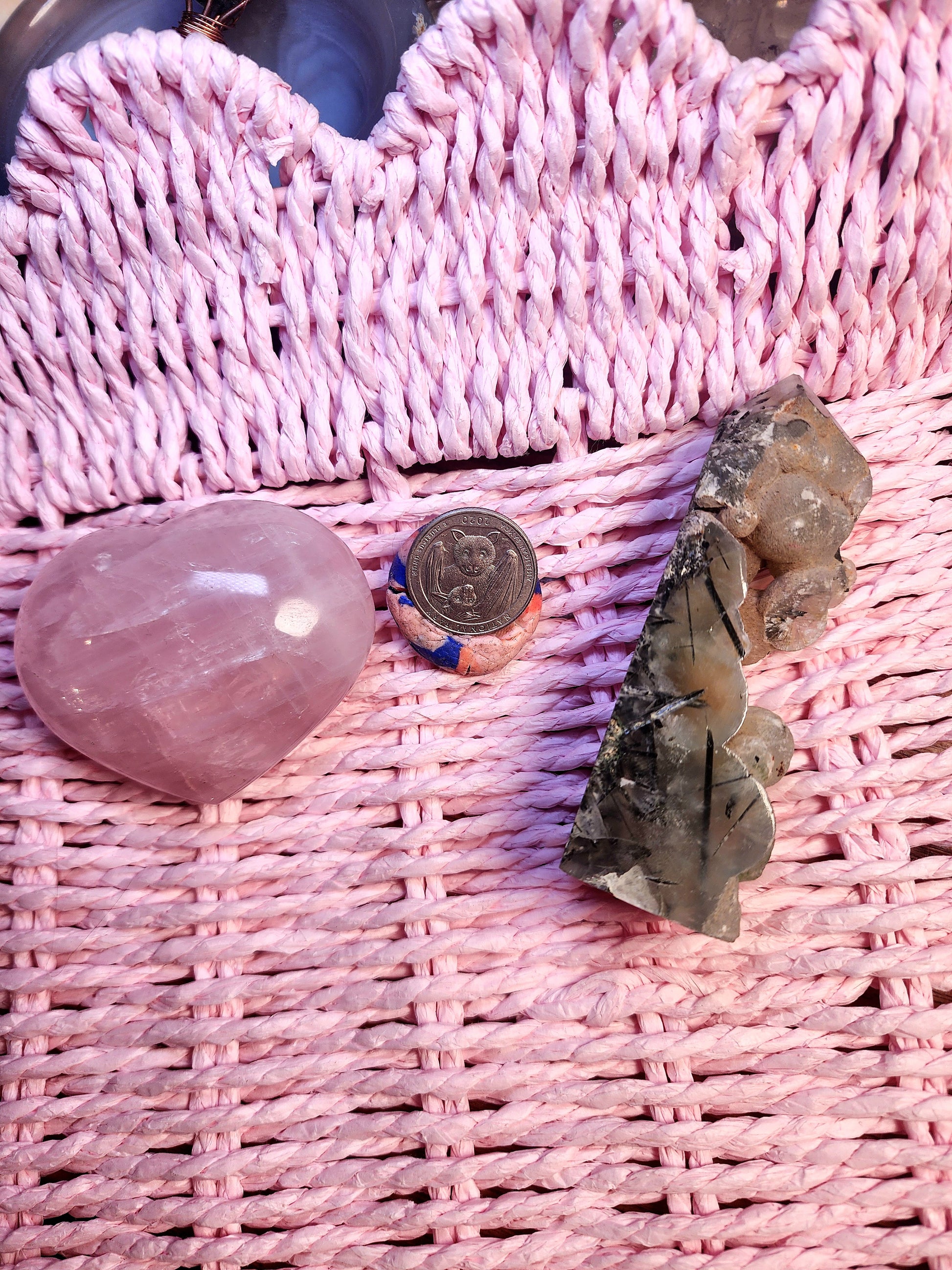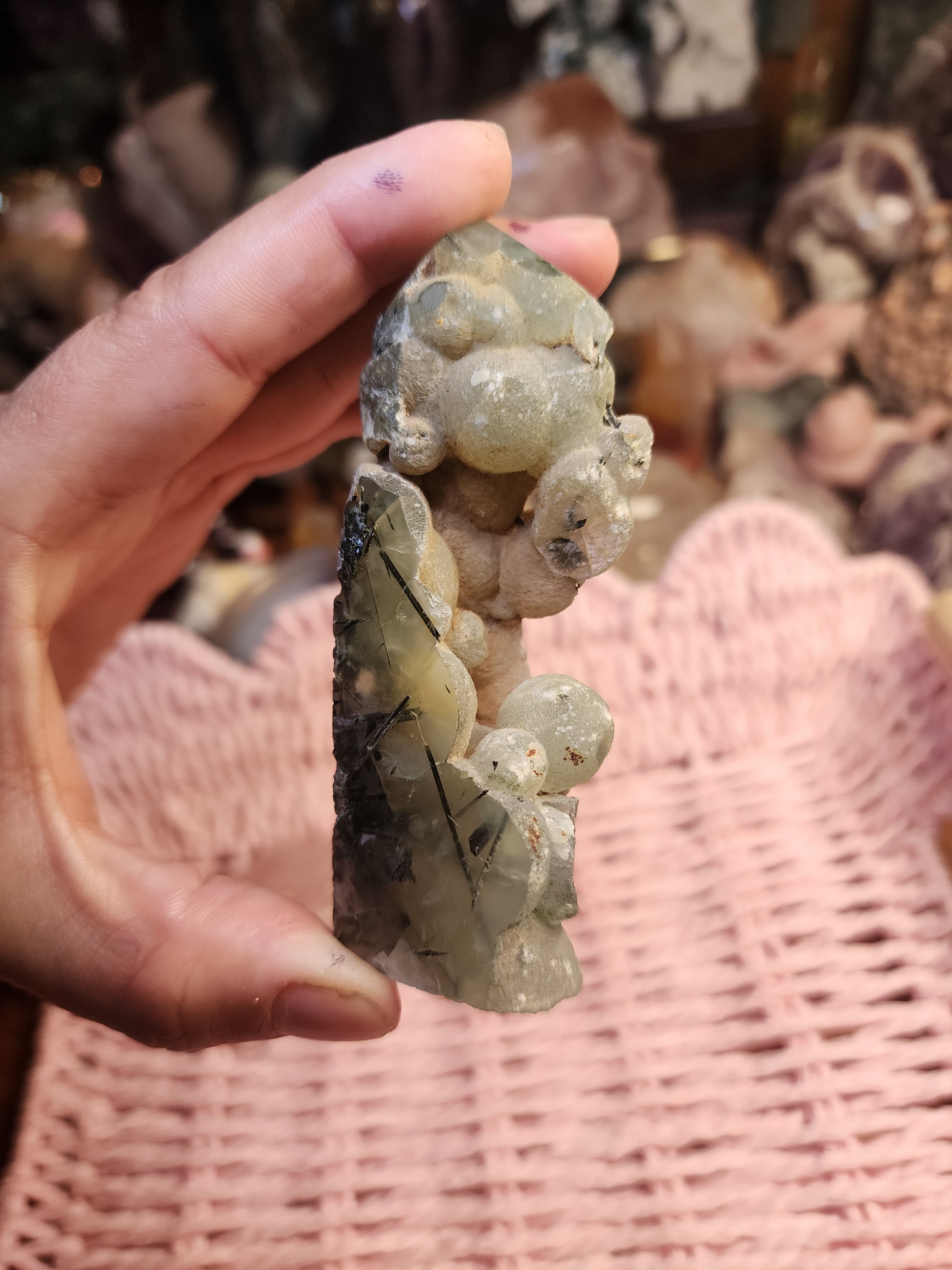 This super unique bundle includes a hq rose quartz heart with rainbows! And a unique phrenite tower with orbital druzy!!