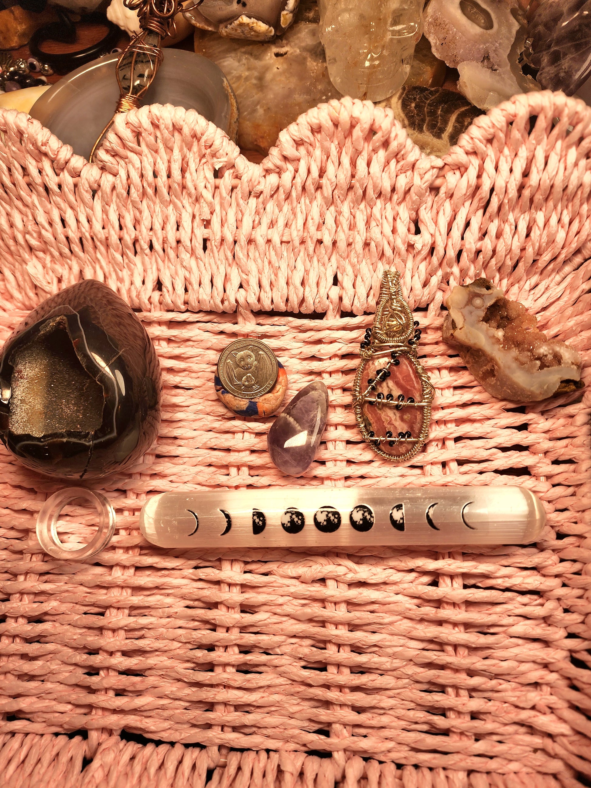 Featuring a DRUZY black agate egg with stand, druzy small pink amethyst, satin spar moon phase wand and a rhodocrosite pendant with citrine then a hq amethyst tumble (looks like a moon rock)