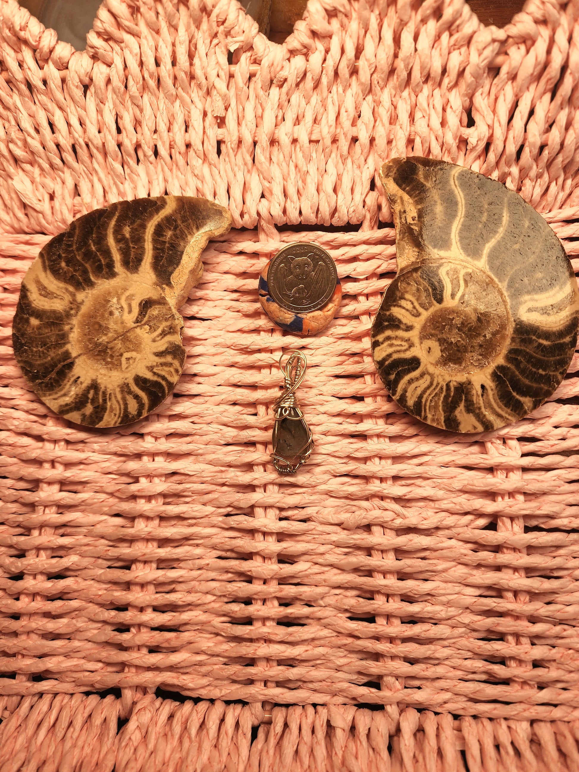 This unique bundle includes a pair of ammonite fossils with a flashy labradorite pendant