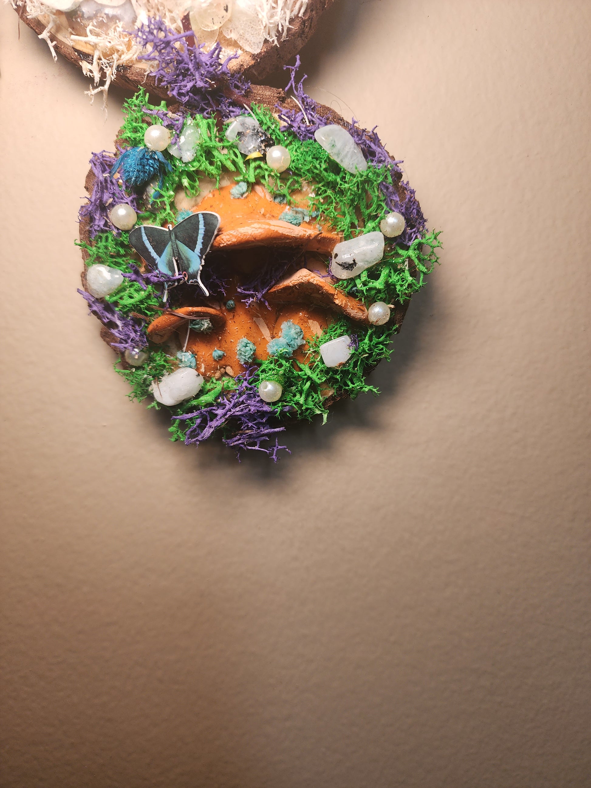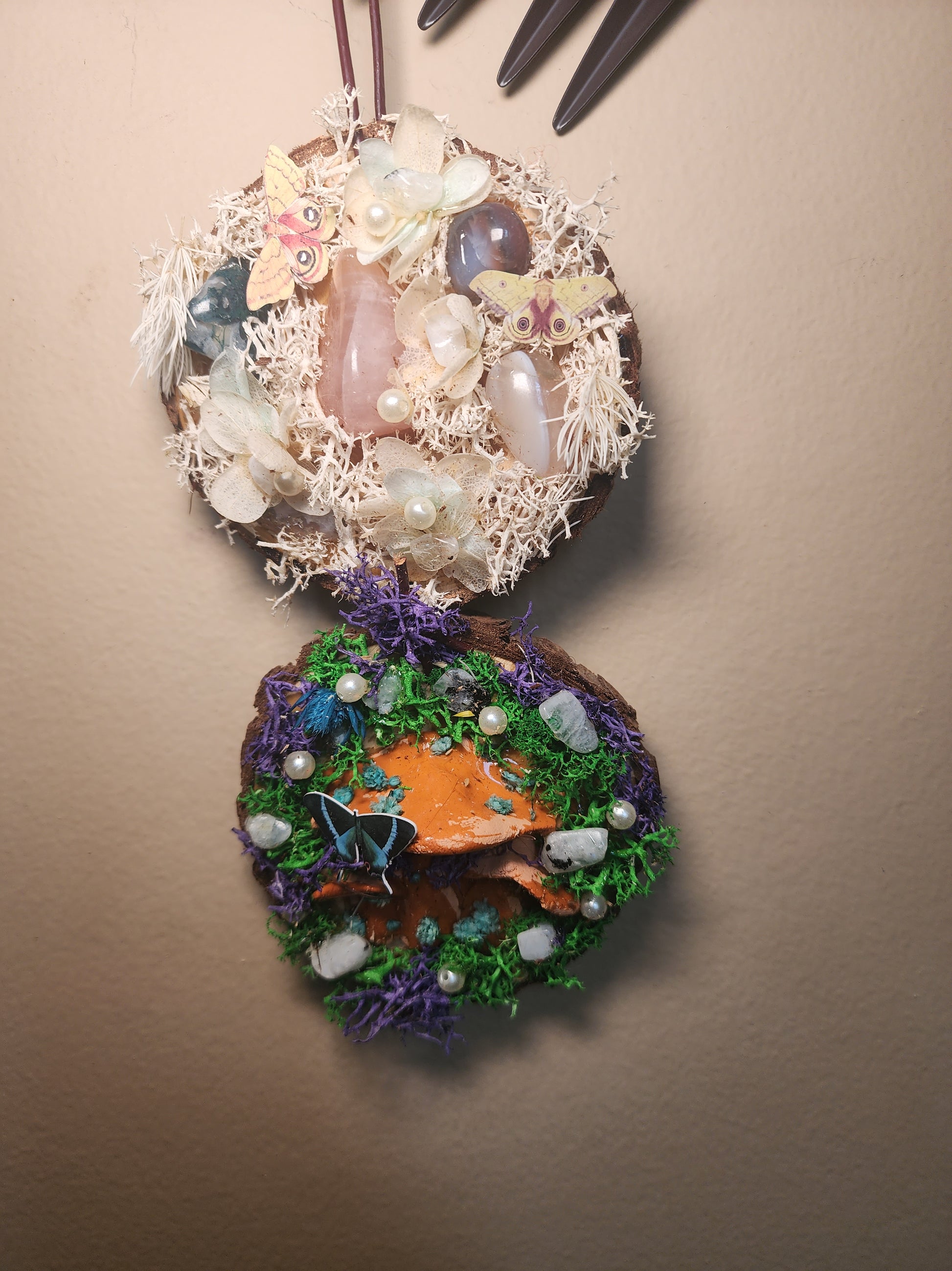 This beauty is adorned with hq rose quartz, banded agate, moss agate, rainbow moonstone, mushrooms & flowers & butterflies/moths! One of my faves!ย