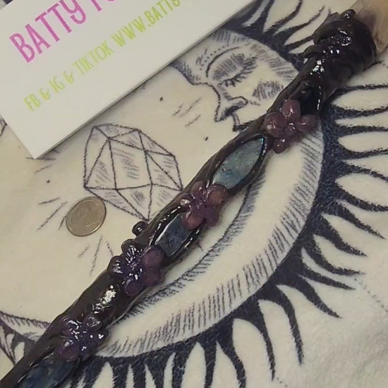 This wand is 16" long and features rainbow fluorite in quartz, flashy labradorite, blue kyanite and black obsidian. Handcrafted with positive intentions. Wands have multiple purposes. One important part is aiding you in opening and closing a sacred circle during a ritual or spell, to keep out negative or I'll will energy into entering your circle. So you can manifest your intentions. Also, aids in transferring energy to a object or area by pointing it at the item or area. Blessed be )0(