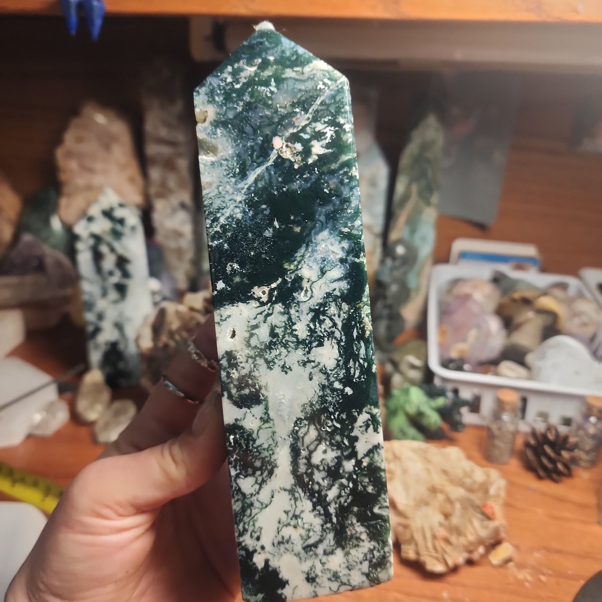 Huge 2lb 2.0oz 8 inch tall moss agate tower!! Has small druzy pockets and amazing blue agate!! With quartz!!!!