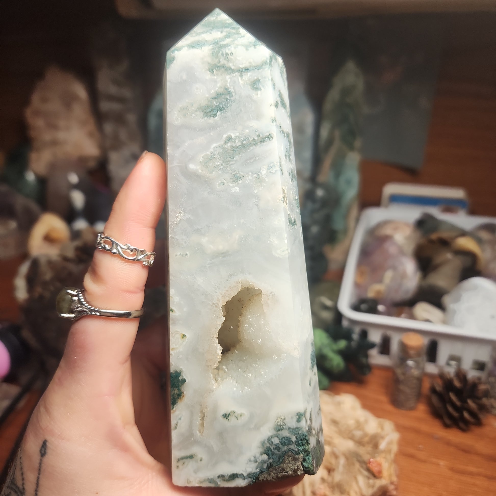 6+ inches tall and weighs 1lb 6.3 oz has two beautiful druzy pockets!!!! With amazing patterns ๐