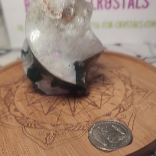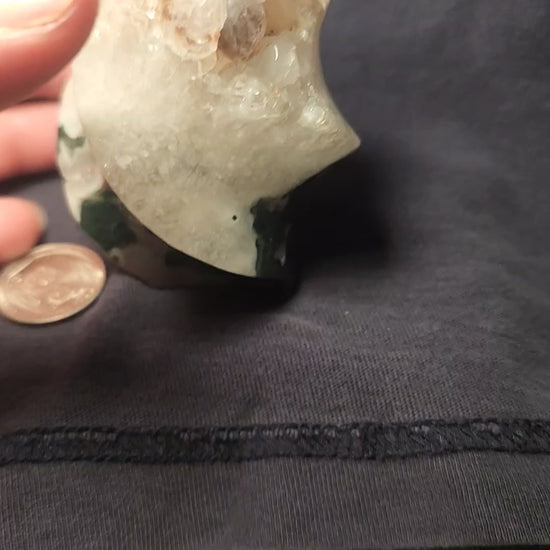 4" with amazing quartz druzy and beautiful moss patterns. 10.2oz