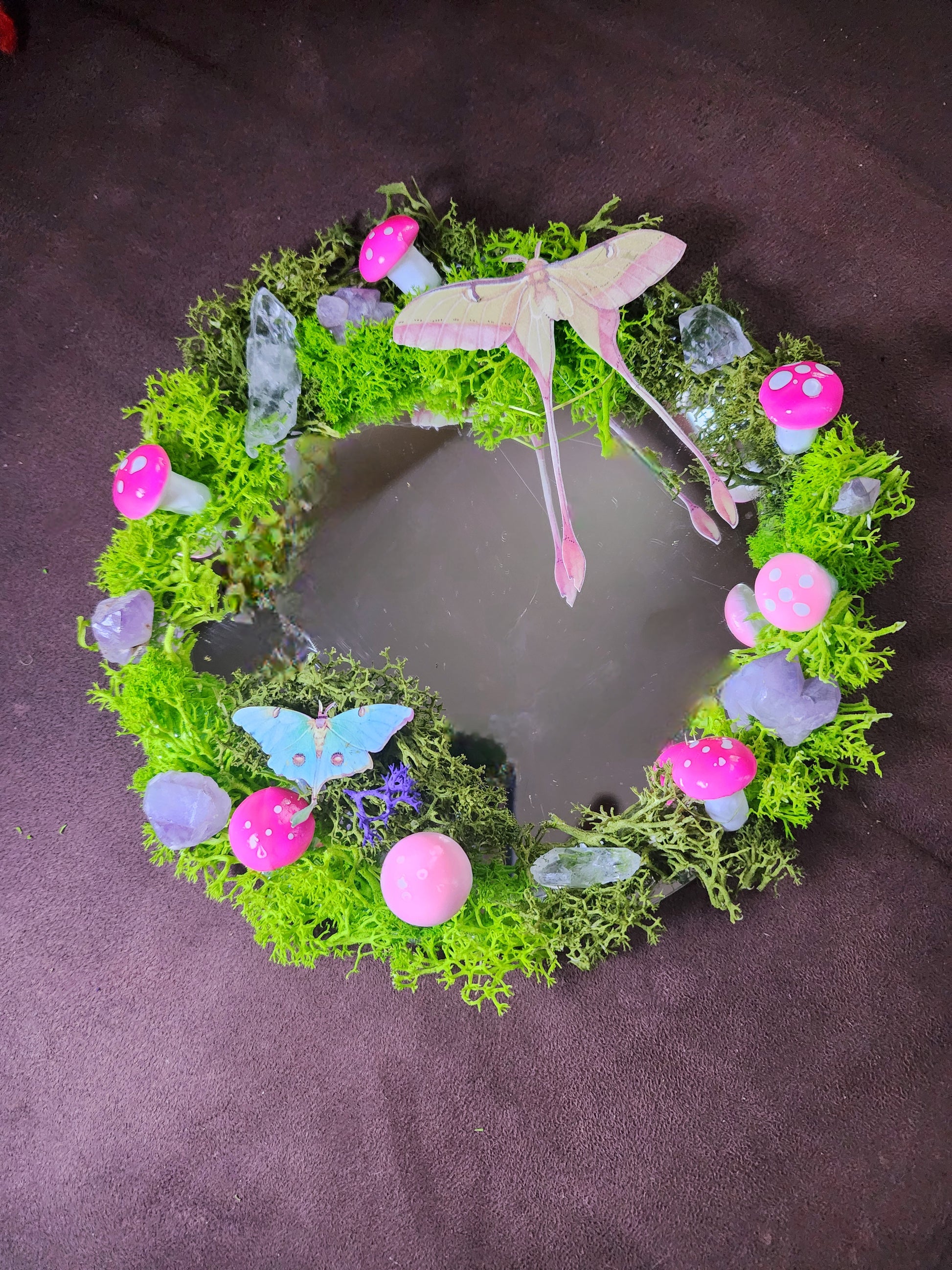 Where the Sun Shines- this mirror represents a bright sunlit forest surrounded by the hillside. A constant cover of sun and winged creatures small & large. Friendship is among all & happiness is shines just as bright as the sun. You can see fairy houses filled with happy families. Mushrooms line the pathways and at night glow fluorescent so bright, you can see the hillside & all its beauty. The skies are a meeting place for all who reside.ย